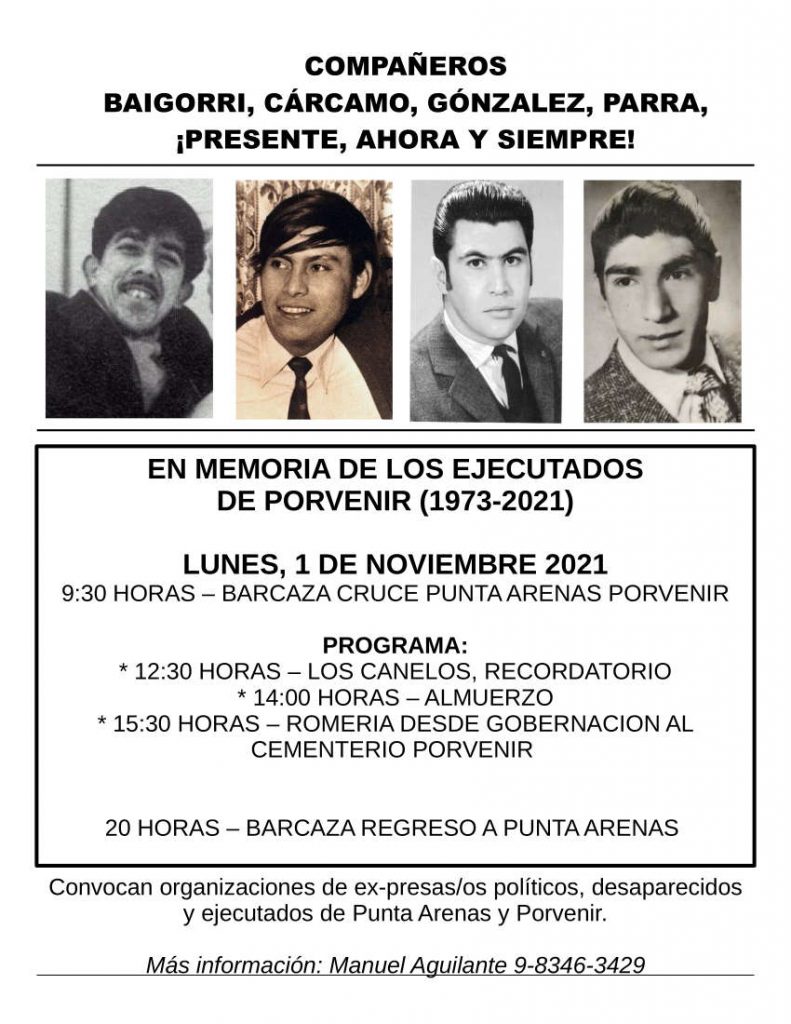 El 1ro. de Noviembre 2021, miembros de organizaciones de ex presos y presas políticos y familiares de ejecutados acudirán nuevamente a Porvenir para recordar a cuatro ex presos políticos ejecutados… Leer más